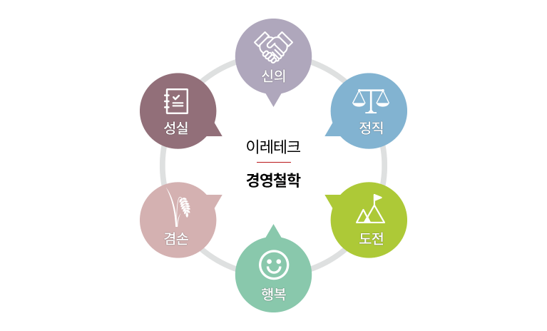 사회 발전에 기여하는 이레테크의 비전과 6가지 경영 철학을 소개합니다.