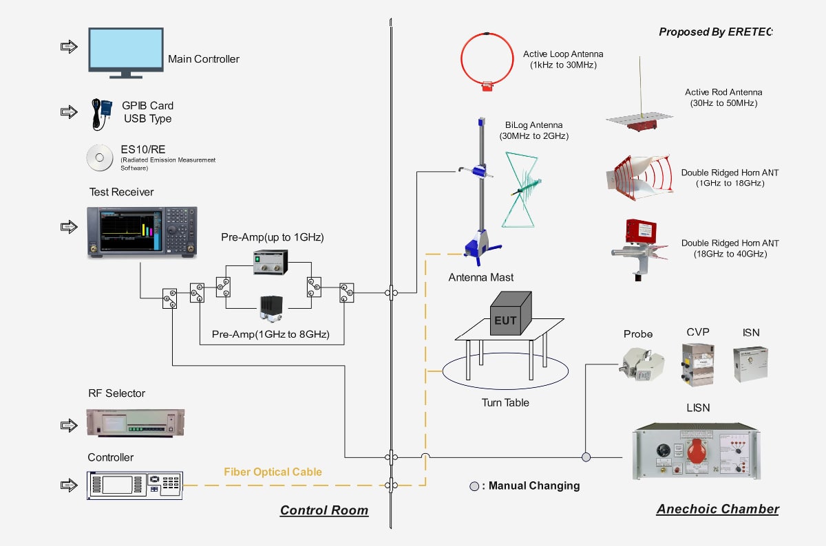 RE(Radiated Emission) 9kHz~18GHz 주파수 대역에서 Dual Antenna Mast 를 이용하여 시험시간을 반으로 절약할 수 있는 구성도 입니다.