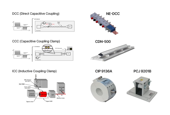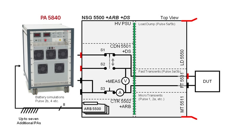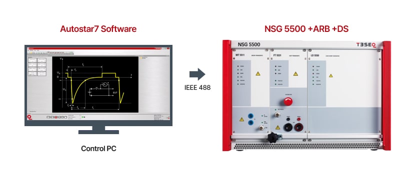 NSG 5500은 6U 크기의 1박스 시스템으로 서지/버스트/전원변동 시험이 모두 가능합니다. 각각의 펼스 모듈이 장착되어 있어 장비간 연결이 간단하고, 케이블 사용을 최소화하여 구성이 깔끔합니다.